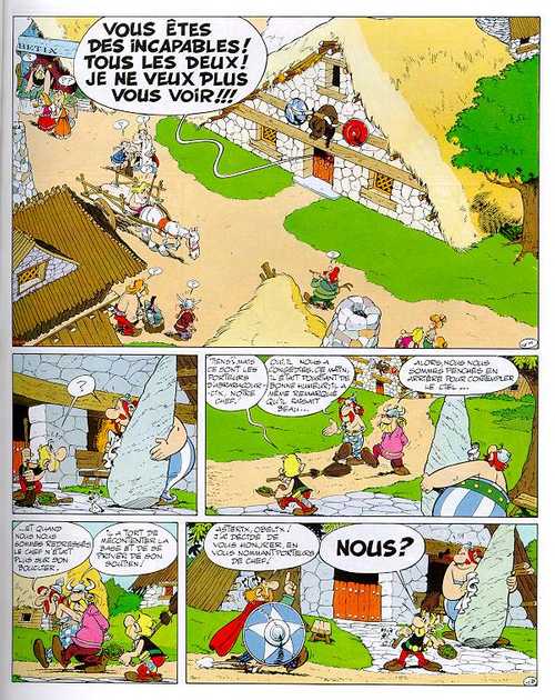 Chaque page est un véritable bonheur. Points de vue, cadrages, gros plan, champ/contre-champ, premiers plans, arrières plans, détails : j'apprends à lire les images avec beaucoup plus de dextérité et de plaisir que les mots. Je passe des heures et des heures à relire chaque album. Je connais par coeur les expressions et les onomatopées. En grandissant, je découvre avec bonheur les subtilités des dialogues, des situations, jusqu'aux prises de positions politiques à déceler à travers les aventures des deux gaulois.